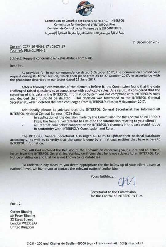 Interpole waraqaa ragaa Dr Zakir Naayikiif kenneen akka jedhetti, kanaan duraa gaaffii mootummaan Indiyaa dhiheesseen Ragaalee Dr Zaakir Naayik ilaallatu kan walitti qabe ta’uu ibsuun, Dr Zaakir Naayik gama isaatiin himannaan mootummaan Indiyaa isarratti dhiheesse dhara tahuu ibsuun ,Interpol dhimma isaa akka keessa deebi’ee ilaaluuf iyyate. Haaluma kanaa ragaa Dr Zaakir dhiheeffate yeroo dheeraaf eega ilaalee booda, himannaan Indiyaa kan seera dhaabbatichaa hin guutin waan ta’eef Ragaa Dr Zaakir Naayik ilaalchiise sassaabame hunda kan haqe tahuu ibse.