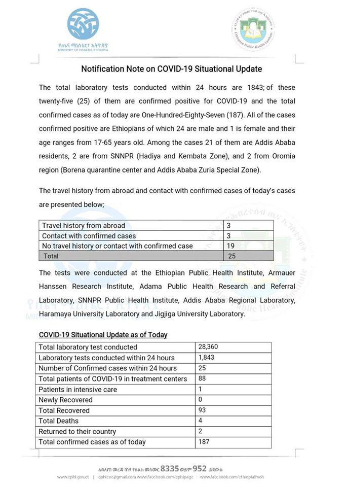 Ministeerri Fayyaa Ityoophiyaa ibsa har’a baaseen, sa’aatii 24 darbe keessatti qorannoo laabratoorii 1,843 geggeesseen, nama 25 irratti vaayirasiin koroonaa argamuu beeksise. Haaluma kanaan biyyattii keessatti lakkoofsi namoota vayirasichaan qabamuu mirkanaayee 187 gahee jira.