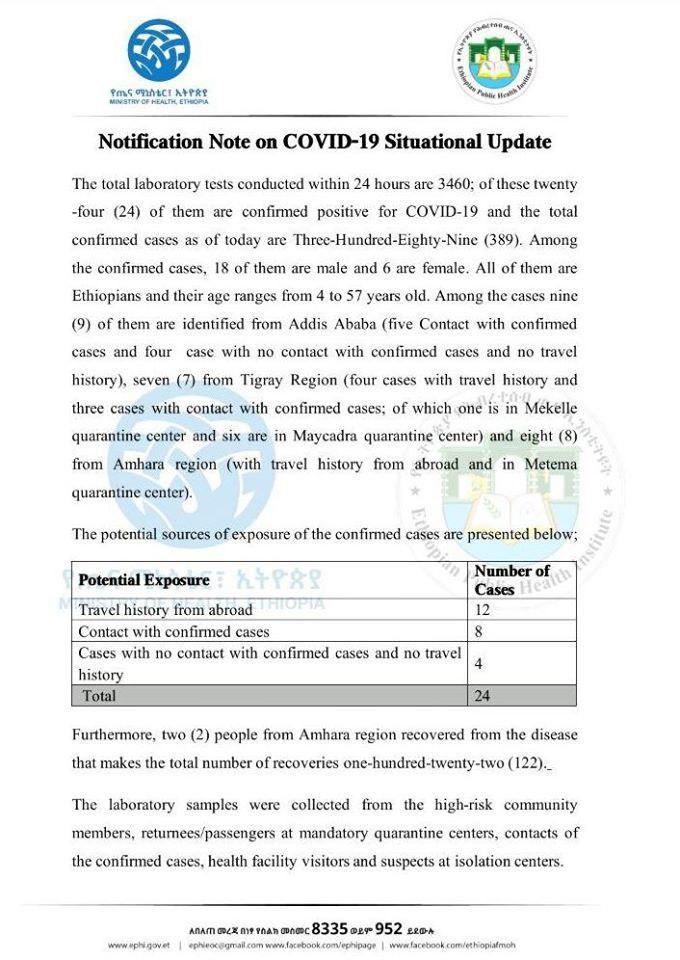 Daayrektarri olaanaan Inistiityuutii Fayyaa Hawaasaa Ityoophiyaa Dr. Eebbaa Abaata gama isaatiin, Namoota 365 hanga kaleessatti vaayrasichaan qabaman keessaa namoonni 56 seenaa imala biyya alaa fi namoota kanaan dura vaayirasichaan qabaman waliin tuttuqaa kanneen hin qabne ta’uun ammoo yaaddoo guddaa tahuu ibse. Guyyaa har’aatis namoonni 24 vaayirasichaan qabamuu kan ibsame yoo tahu, haaluma kanaan biyyattii keessatti lakkoofsi namoota vaayirasichi irratti argamee 389 gahee jira.