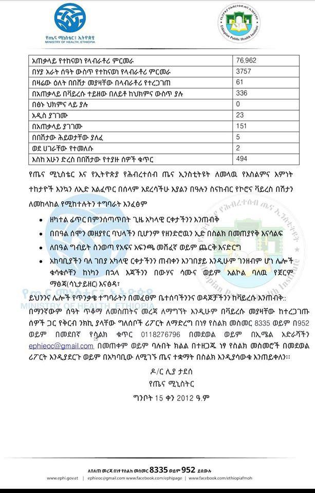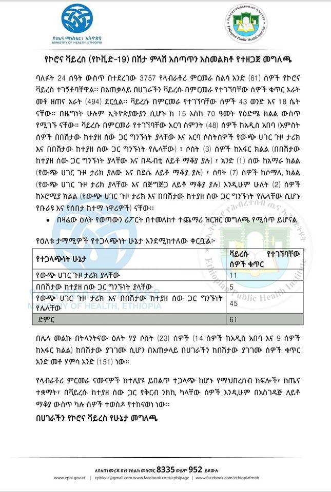 Ministeerri Fayyaa Ityoophiyaa ibsa har’a baaseen, sa’aatii 24 darbe keessatti qorannoo laabratoorii 3,757 geggeesseen, namoota 61 irratti vaayirasiin koroonaa argamuu beeksise. Haaluma kanaan biyyattii keessatti lakkoofsi namoota vayirasichaan qabamuu mirkanaahee 494 gahee jira.