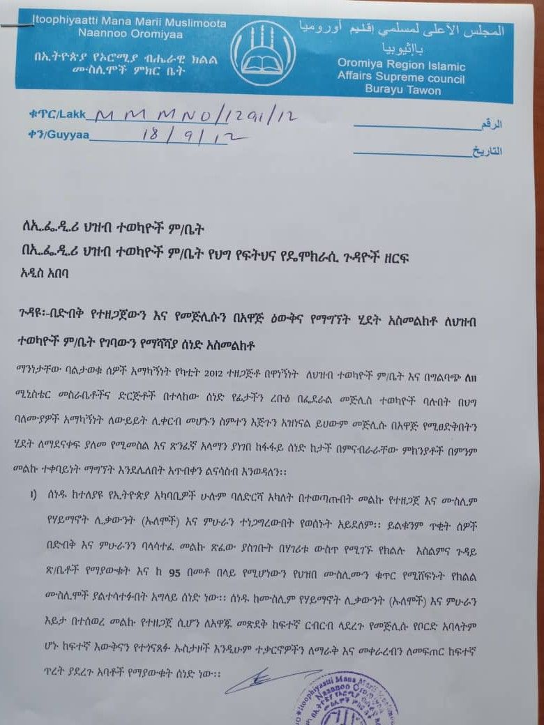 Majlisni Naannoo Oromiyaa xalayaa fuula afur qabu kan guyyaa kaleessaa koree dhabbii Paarlamaaf erge irratti, Sanadni wixineen seeraa labsii Majlisaa ilaalchisee akka fooyya’u jedhu, kan hoggantoota muraasa Majlisa Federaalaa irraa dhiyaate, kan Muslimoota naannichaa 95% bakka hin buune jechuun balaaleefate.