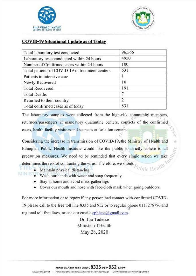 Haaluma kanaan Ityoophiyaa keessatti baay’inni namoota Vaayirasii Koronaatiin qabamanii 831 kan gahe yoo ta’u, namoonni 191 ammoo dhibee kanarraa fayyuu ibsame.