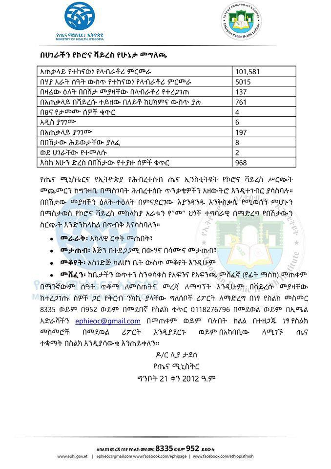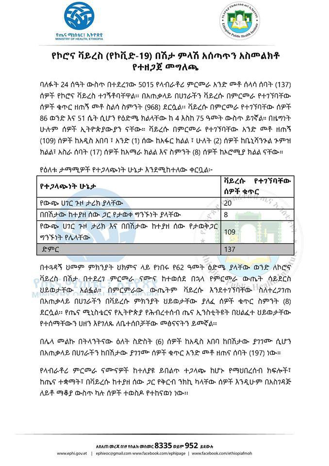 Ministeerri Fayyaa Ityoophiyaa ibsa Jum’aa har’aa baaseen, sa’aatii 24 darbe keessatti qorannoo laabratoorii 5,015 geggeesseen, namoota 137 irratti vaayirasiin koroonaa argamuu beeksise. Haaluma kanaan biyyattii keessatti lakkoofsi namoota vayirasichaan qabamuu mirkanaahee 968 gahee jira.