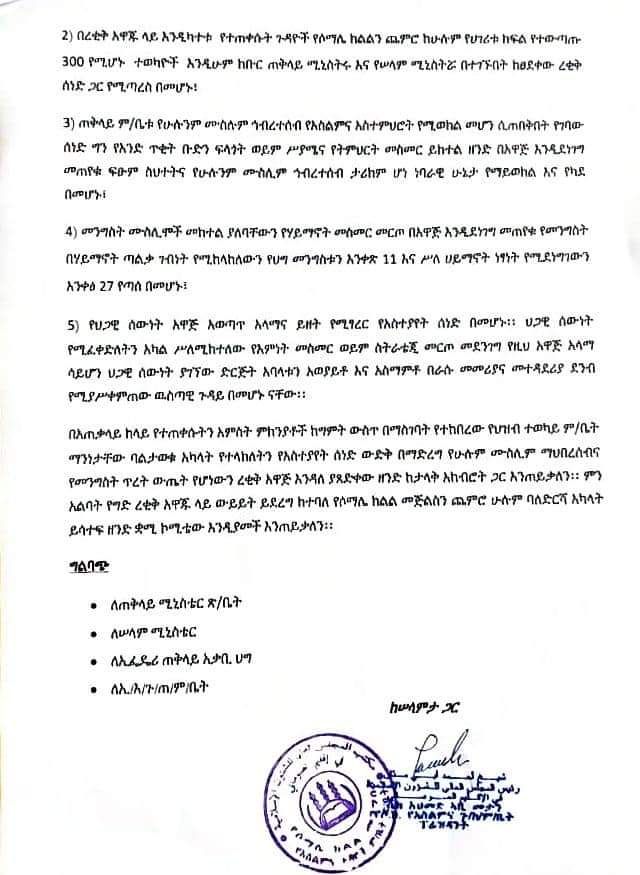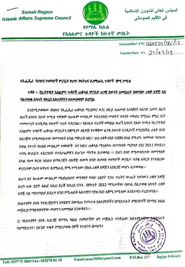 Manni marii dhimmoota Islaamaa naannoo Somaalee, sanada fuula 11 qabu kan hoggantoota majlisa Federaalaa muraasa tahan irraa, wixineen seeraa manni marii dhimmoota Islaama Itoophiyaa labsiin akka hundeeffamu gaafatu akka fooyya’u jechuun, koree dhabbii dhimma seeraa, haqaa fi dimookrasii mana marii bakka bu’oota ummataf dhiyaate balaleefatuun ibsa baase.