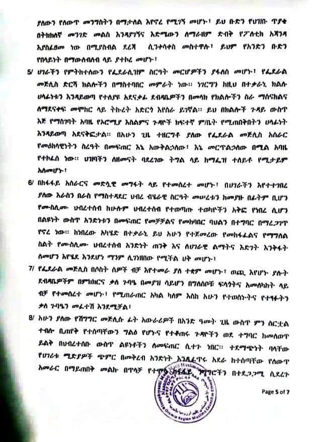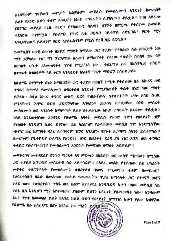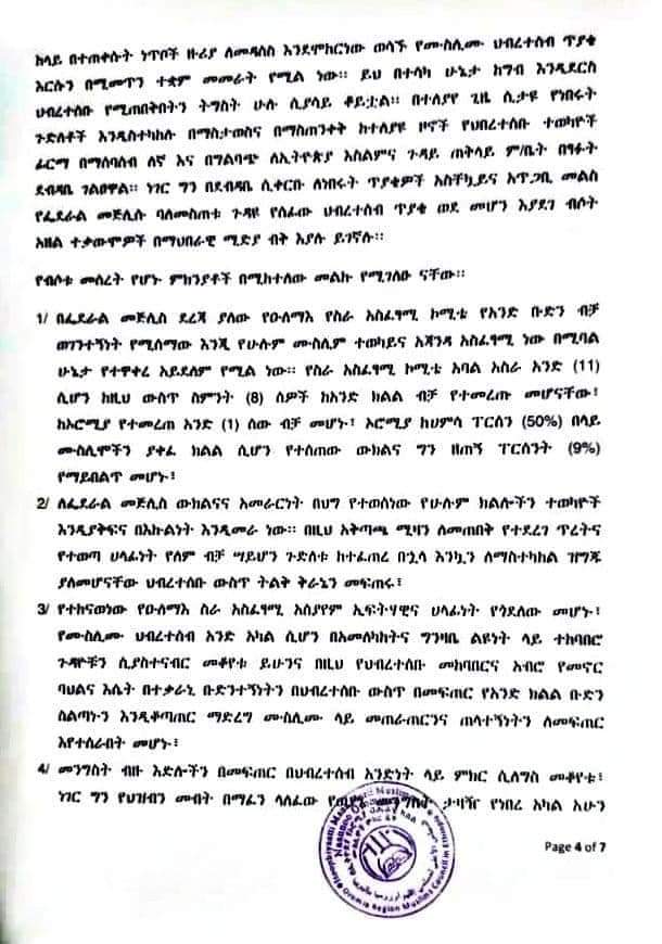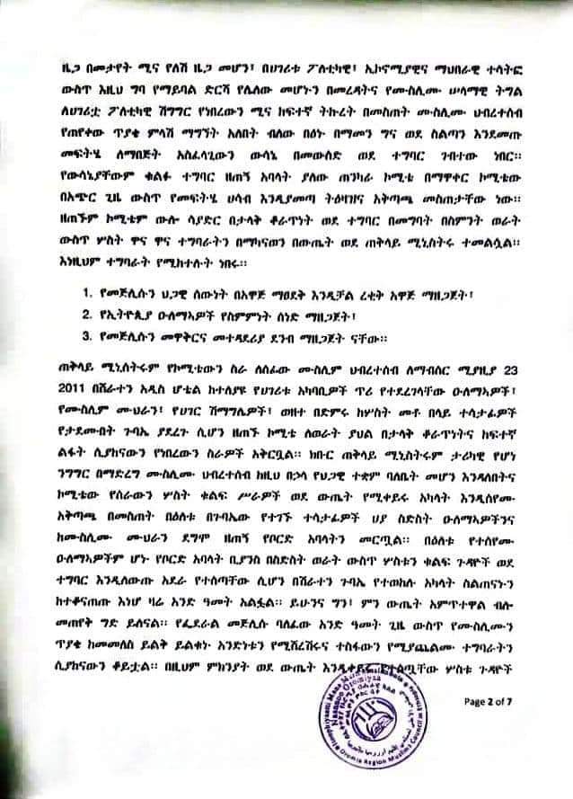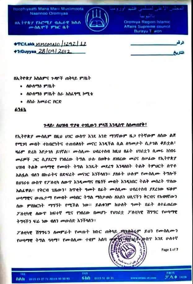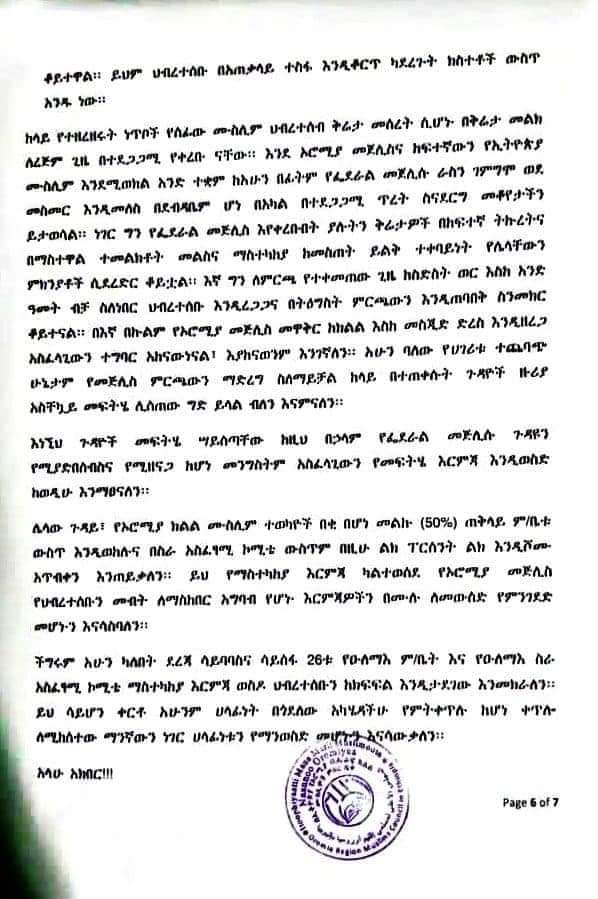 Majlisni Oromiyaa xalayaa fuula 6 qabu kan Majlisa Federaalaaf barreese irratti, Majlisni Federaalaa yeroof amaanaan hoggantoota aangoo irratti argamanitti kennamuu kaase. Qaamoleen kun immoo aangoo itti kenname kanaan tokkummaa ummata Muslimaaf hojjatuu caalaa, Muslima gareen qoqqoodaa jiraatuu ibse.