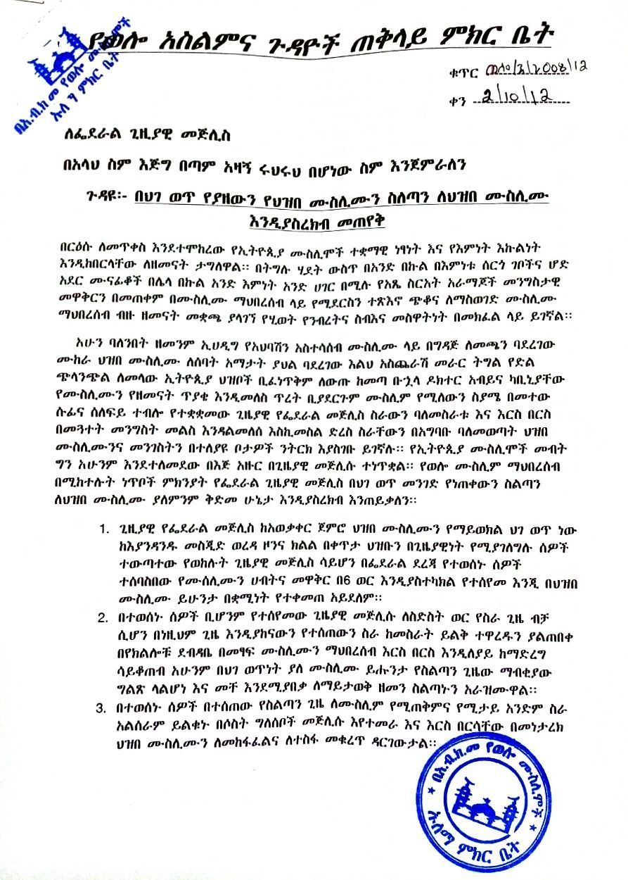 Manni marichaa xalayaa fuula lama qabu kan guyyaa har’aa, hoggantoota majlisa Federaalaa aangoo irratti argamaniif barreese irratti, hoggantoonni ammatti aangoo harkaa qaban kunniin, kan bakka bu’oota majlisa godinaalee biyyattii gara garaa irraa yeeroof bakka buufaman malee, kan ummanni bakka hin buusiin tahuu fi aangoo itti kenname kanaan immoo tokkummaa ummata Muslimaaf hojjatuu caalaa, Muslima gareen qoqqoodaa jiraatuu ibse.