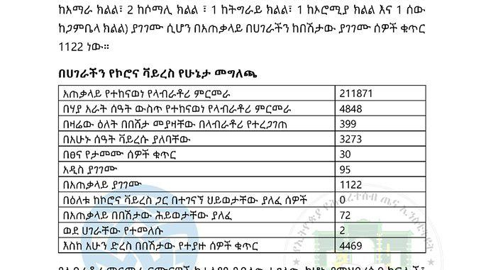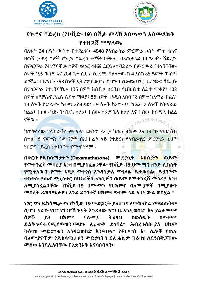 Ministeerri Fayyaa Ityoophiyaa ibsa har’a baaseen, sa’aatii 24 darbe keessatti qorannoo laabratoorii 4,848 geggeesseen, nama 399 irratti vaayirasiin koroonaa argamuu beeksise. Haaluma kanaan biyyattii keessatti lakkoofsi namoota vayirasichaan qabamuu mirkanaayee 4,469 gahee jira.