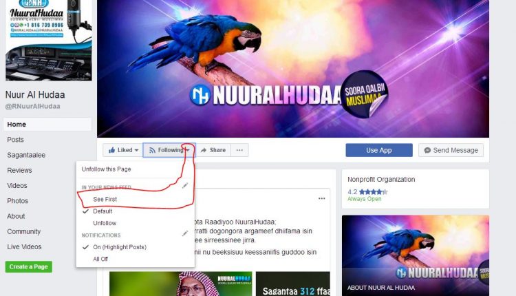 3ffaa. Eega Peejii Nuuralhudaa Like gootee booda ammoo, wanti nuti Peejii irratti maxxansinu hundi akka dursee gubbaa irratti siif dhufu yoo barbaadde, mallattoo Follow jedhu kanarraa Xiyyaa gama gadii akeektu san tuqi. achi keeysaa filannoo “in your news feed” ka jedhu jalaa, “See first ka jedhu filadhu. achi booda yeroo hunda wayta facebook kee bantu wanti peejii nuuralhudaa irratti maxxanfame durarratti siif dhufa.